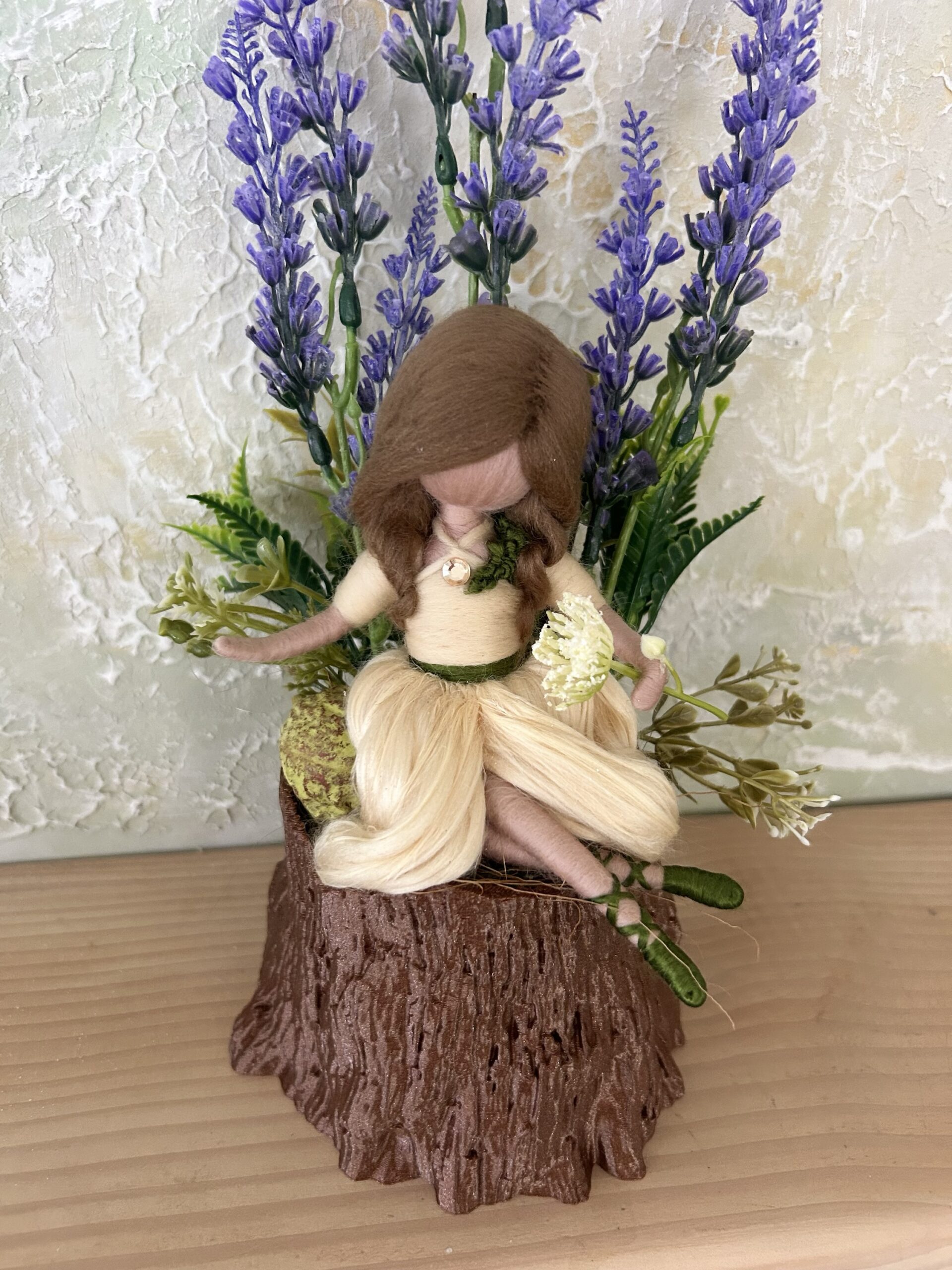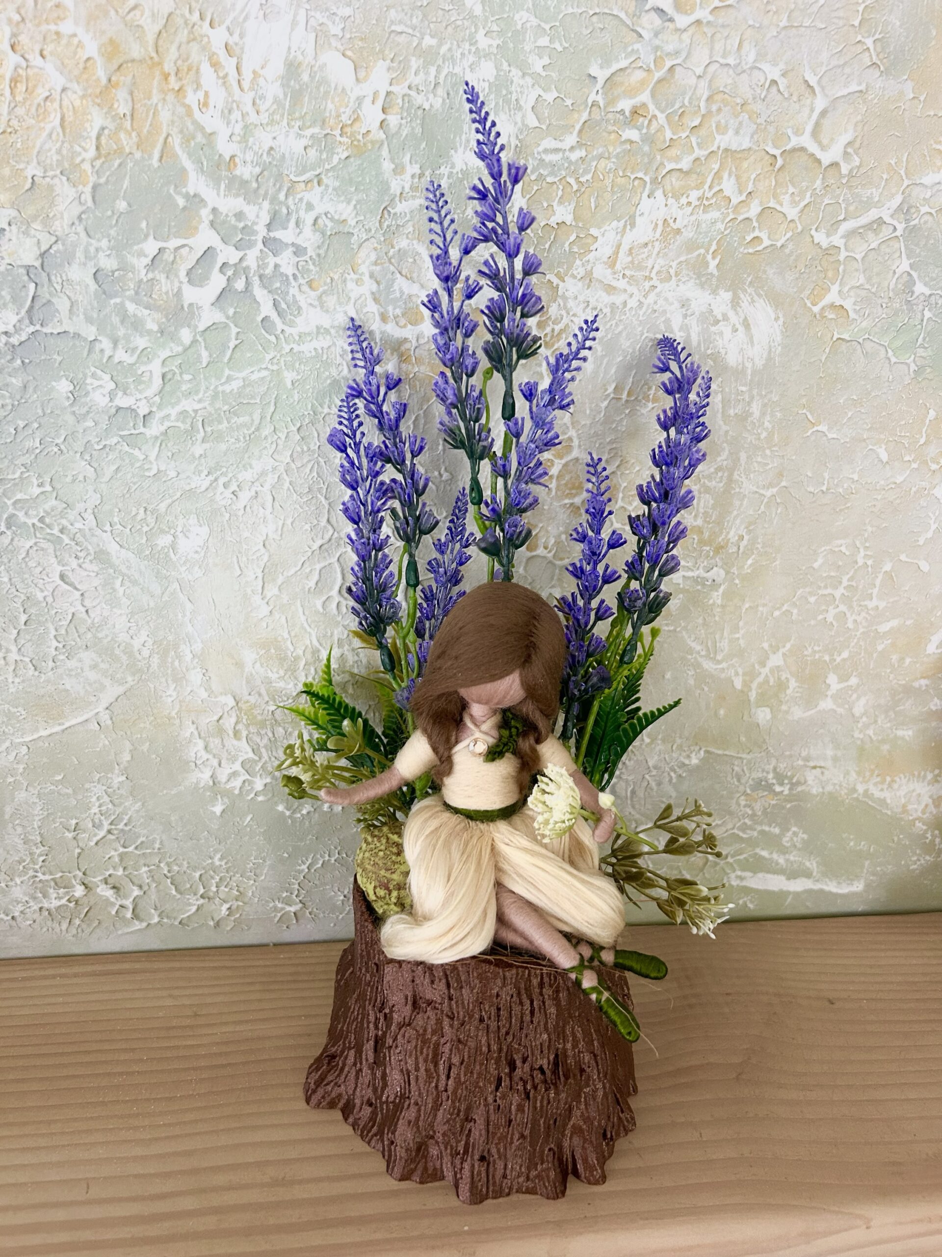 Kb 34 cm magas fatörzs mintájú kaspóba épített lila virágos tündéres dekoráció.